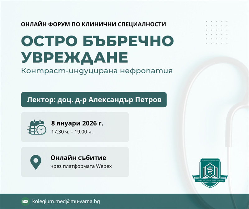 Медицински университет „Проф. д-р Параскев Стоянов“ – Варна продължава инициативата си за онлайн дискусионни форуми по клинични специалности. Поредното събитие ще се проведе на 8 януари г. (четвъртък) от 17:30 до 19:00 ч. на тема: „Остро бъбречно увреждане. Контраст индуцирана нефропатия“