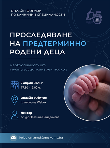 Медицински университет „Проф. д-р Параскев Стоянов“ – Варна продължава инициативата за онлайн дискусионни форуми по клинични специалности с нова обучителна сесия. Тя ще се проведе на 2 април 2026 г. (четвъртък) от 17:30 до 19:00 ч. на тема: „Проследяване на предтерминно родени деца – необходимост от мултидисциплинарен подход“.