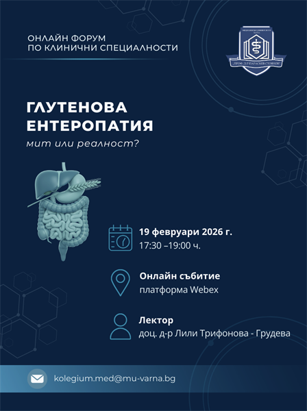 Медицински университет „Проф. д-р Параскев Стоянов“ – Варна продължава инициативата си за онлайн дискусионни форуми по клинични специалности. Поредното събитие ще се проведе на 19 февруари (четвъртък) от 17:30 до 19:00 ч. на тема: „Глутенова ентеропатия – мит или реалност“.