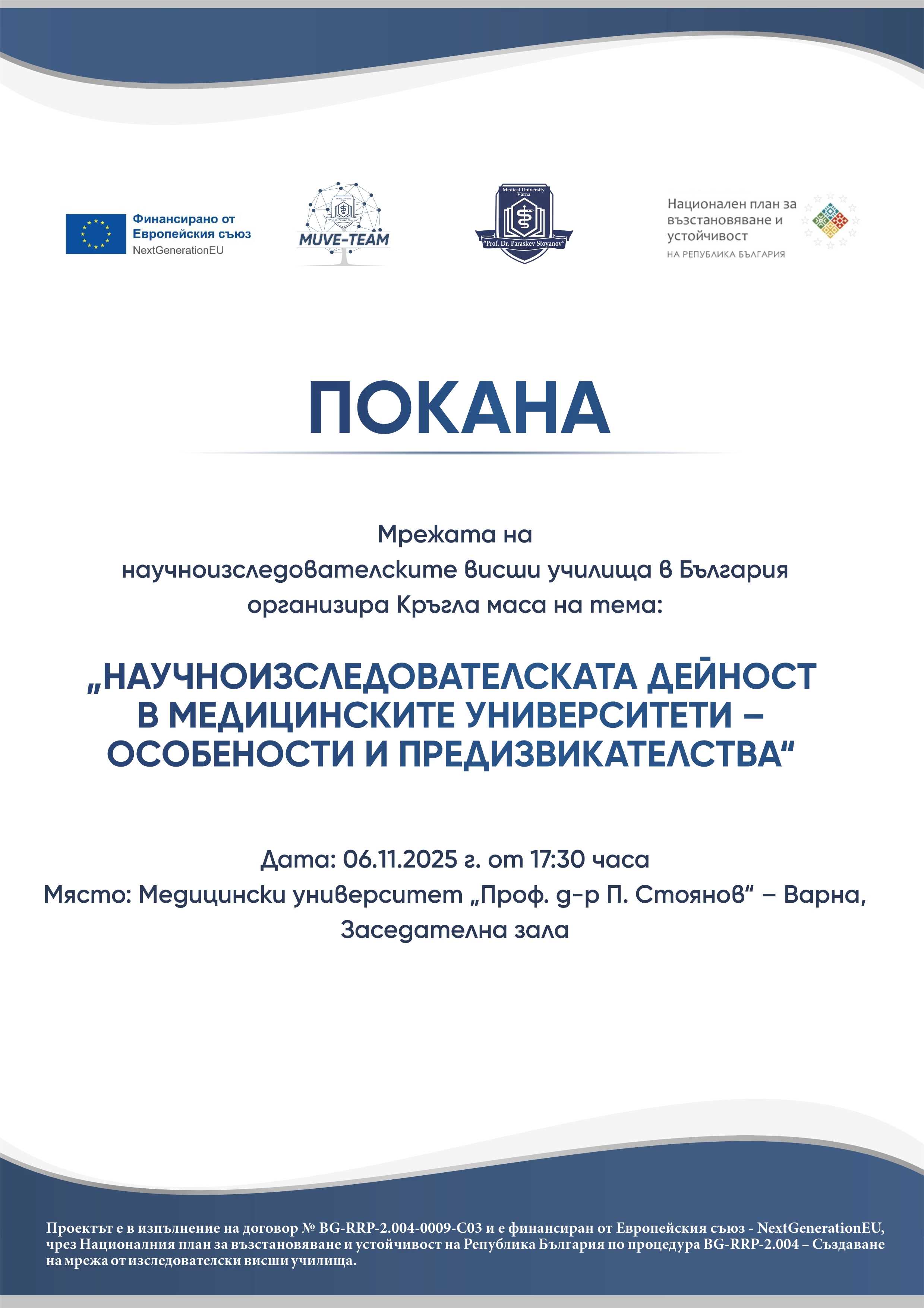 На 6 ноември 2025 г. от 17.30 ч. в Заседателна зала на МУ-Варна ще се проведе кръгла маса на тема „Научноизследователската дейност в медицинските университети – особености и предизвикателства“. Организатор на събитието е Мрежата на научноизследователските висши училища в България.