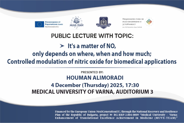На 4 декември от 17:30 ч. в Трета аудитория на МУ-Варна известният учен Хоуман Алиморади от Université Libre de Bruxelles, Белгия, ще изнесе публична лекция на тема: It's a matter of NO, only depends on where, when and how much; Controlled modulation of nitric oxide for biomedical applications. Визитата на гост-лектора от Белгия е по проект № BG-RRP-2.004-0009-C02 "Медицински университет - Варна: Повишаване на транслационните постижения в медицината (MUVE-TEAM)", в рамките на т. 3.3. Международно сътрудничество в стратегическите области на висшето училище.