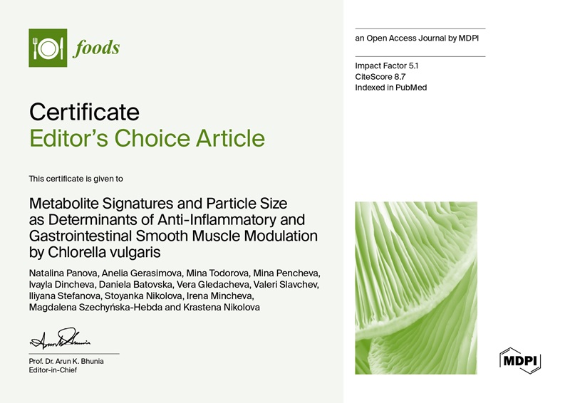 Научна публикация със заглавие “Metabolite Signatures and Particle Size as Determinants of Anti-Inflammatory and Gastrointestinal Smooth Muscle Modulation by Chlorella vulgaris", с авторски колектив от научна група 3.1.2. SMART (R&D Laboratory for dietary supplements), съвместно с изследователи от други научни звена е избрана за статия „Избор на редактора“ на престижното списание „Foods“ за третото тримесечие на 2025 година. Изследването е реализирано в изпълнение на Проект № BG-RRP-2.004-0009-C02/ 31.12.2022 г. Медицински университет – Варна: Повишаване на транслационните постижения в медицината (MUVE-TEAM), финансиран от Европейския съюз-NextGenerationEU, чрез Националния план за възстановяване и устойчивост на Република България.