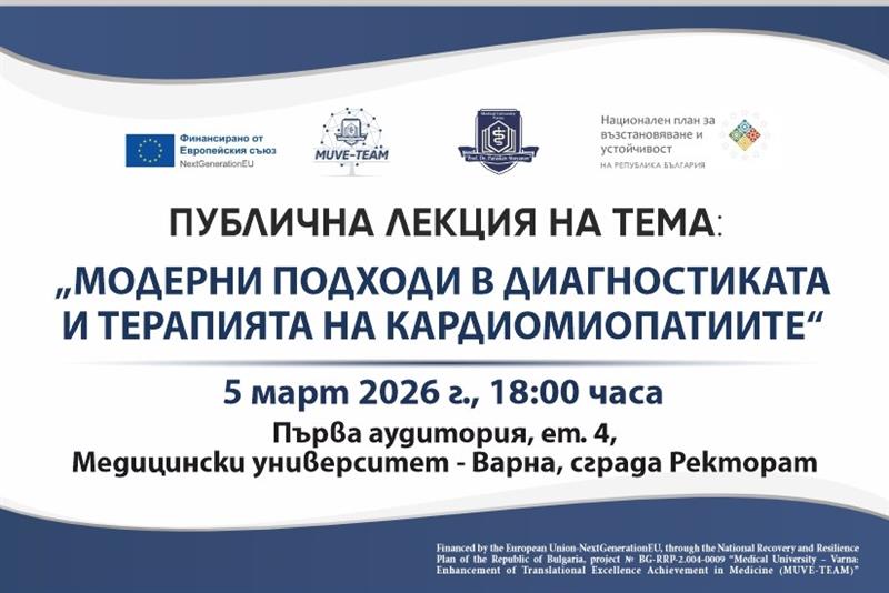 На 5 март от 18 ч. в 1-ва аудитория на Медицински университет – Варна ще се състои публична лекция на тема „Модерни подходи в диагностиката и терапията на кардиомиопатиите“. Гост-лектор е д-р Зорница Шоманова – специалист по вътрешни болести и кардиология с дългогодишен клиничен, преподавателски и управленски опит в Германия. Лекцията е отворена за студенти, докторанти, членове на академичната общност и всички, които проявяват интерес към темата.