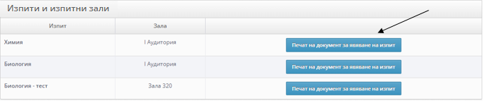 Срещу наименованието на изпита ще се визуализира в коя зала и в коя сграда трябва да се явят. Разпечатването на документа за явяване на изпит (документ с входящ номер) става от бутона „Печат на документ за явяване на изпит“. Кандидат-студентите разпечатват файла, който ще се генерира в един екземпляр (възможно е представянето на документа и в електронен вид – например на екрана на мобилно устройство).
