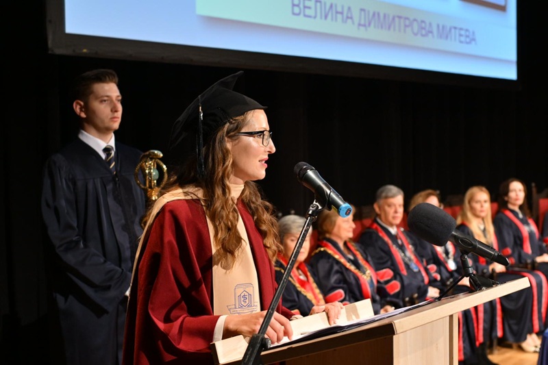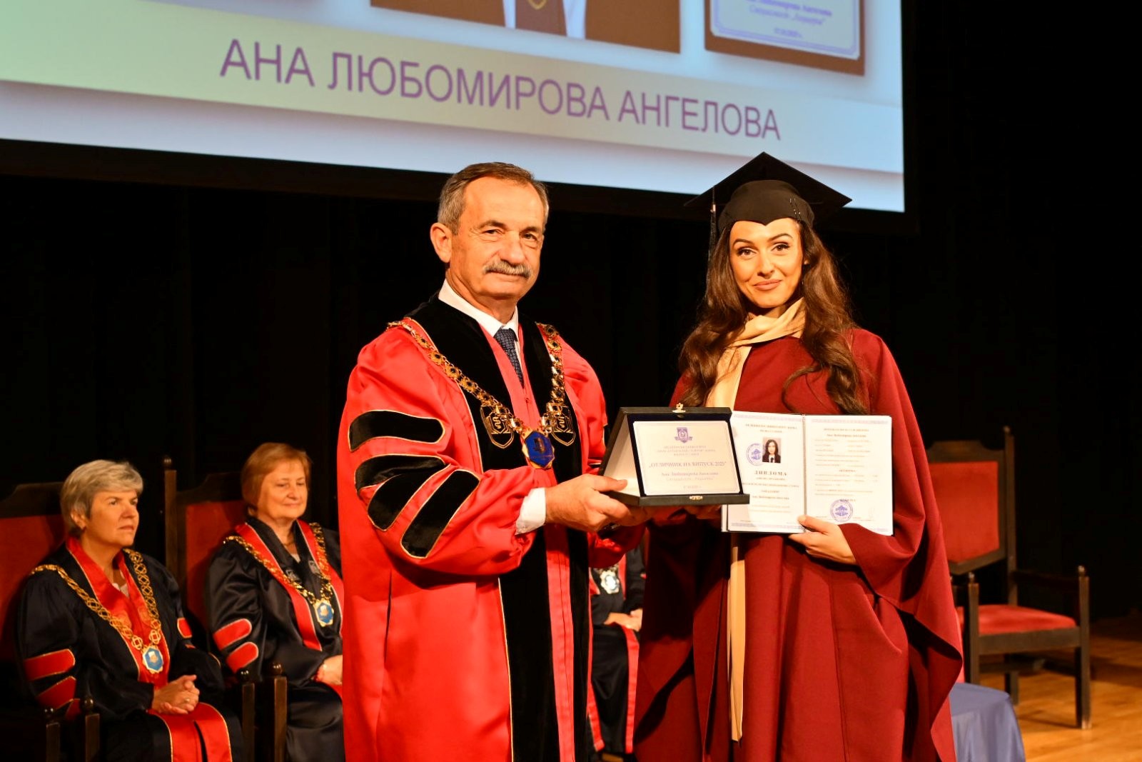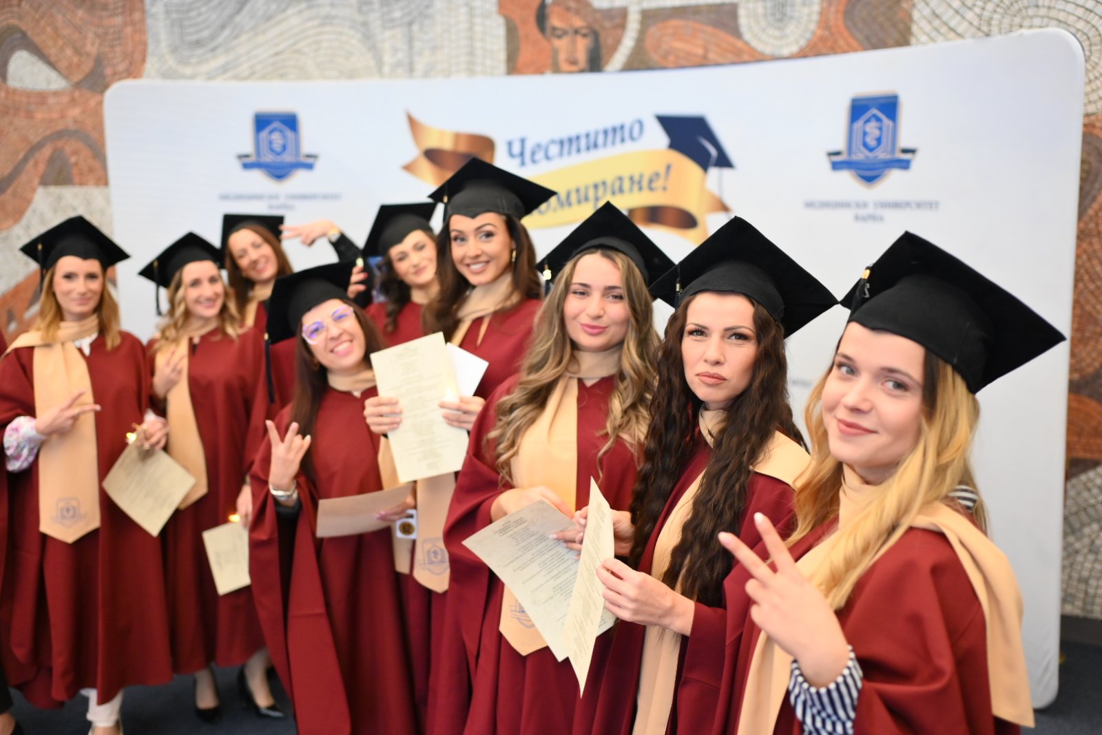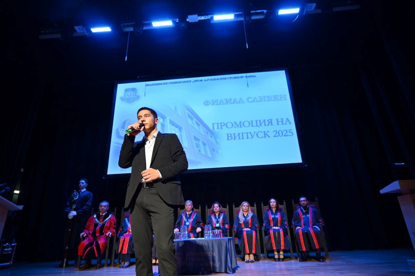 След полагането на тържествената клетва проф. Димитър Райков връчи дипломите на абсолвентите. От името на Випуск 2025 Велина Митева изказа благодарност към академичното ръководство и преподавателите за подкрепата и вдъхновението по време на обучението. Всички отличници получиха парични награди от ректора, а всички абсолвенти – предметни награди от МУ – Варна и от Община Сливен.