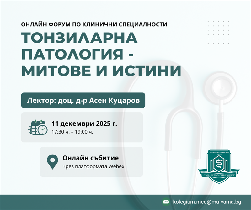 Медицински университет „Проф. д-р Параскев Стоянов“ – Варна продължава инициативата си за онлайн дискусионни форуми по клинични специалности. Поредното събитие ще се проведе на 11 декември 2025 г. (четвъртък) от 17:30 до 19:00 ч. на тема: „Тонзиларна патология – митове и истини“.