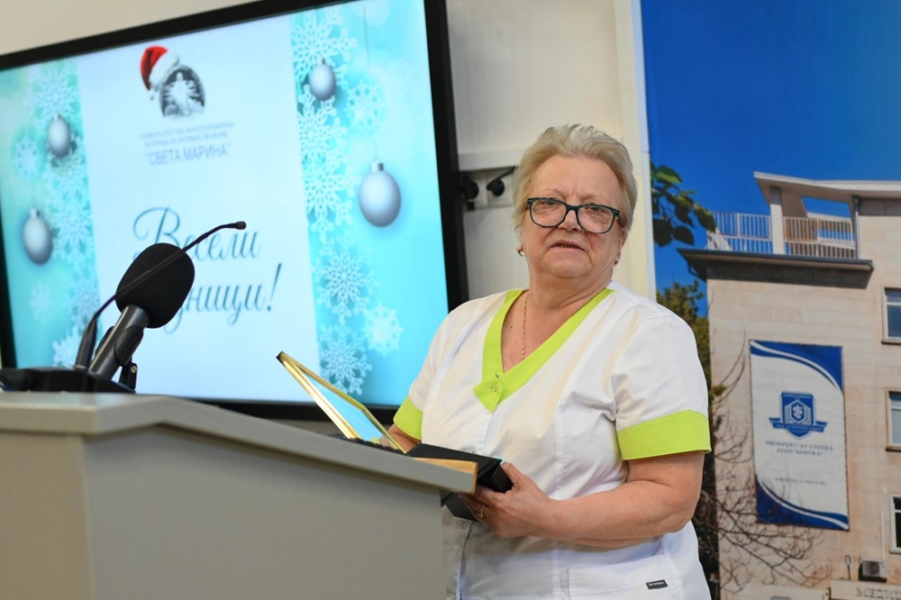 На тържествен медицински съвет, проведен в навечерието на Рождество Христово, в знак на благодарност за дългогодишната безупречна работа, постигнатите високи резултати и висок професионализъм, проф. д-р Силва Андонова, изпълнителен директор на УМБАЛ „Св. Марина“, награди с почетен плакет и грамота д-р Росен Рачев от Клиниката по клинична хематология, инж. Светослав Стоянов – началник-отдел „Аварийни ремонти и поддръжка на сградния фонд“, медицинска сестра Нели Григорова от Клиниката по вътрешни болести и медицинска сестра Гергина Каишева от Клиниката по съдова хирургия. С отличия бе наградена и медицинска сестра Станка Петрова от Първа клиника по кардиология.