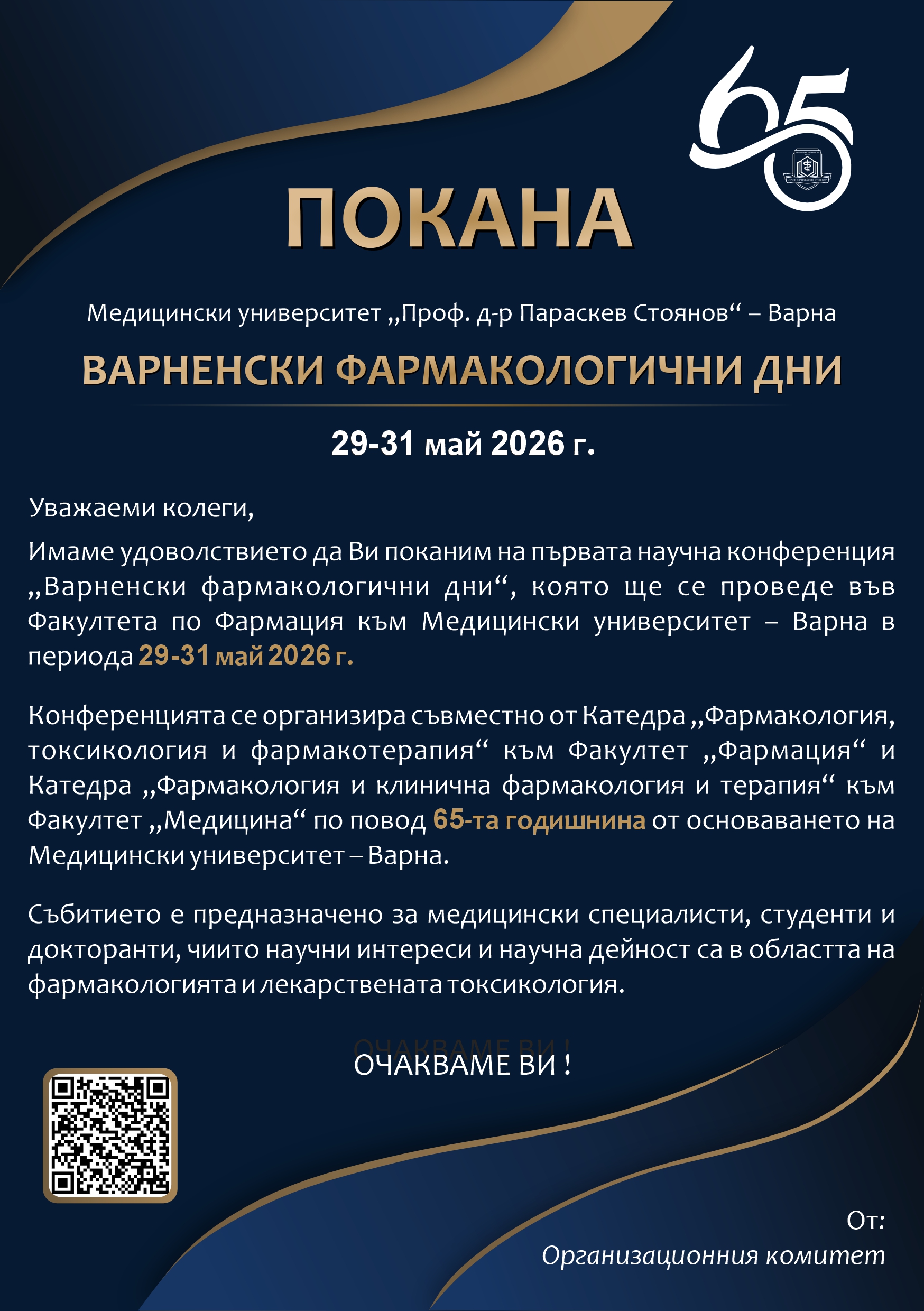 По повод 65-годишнината от основаване то на МУ-Варна, катедра „Фармакология, токсикология и фармакотерапия“ към Факултета по фармация и катедра „Фармакология, клинична фармакология и терапия“ към Факултета по медицина имат удоволствието да Ви поканят на първата научна конференция „Варненски фармакологични дни“.