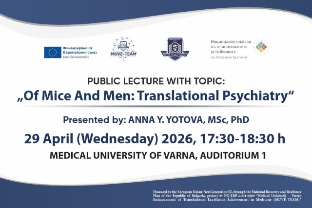 On 27 and 28 April 2026, Medical University – Varna will host the MUVATHON High Tech MUVE Conference “Ways Forward – Integration, Cooperation, Open Minds". The event is organised under the project “MU-Varna: Enhancement of Translational Excellence Achievement in Medicine (MUVE-TEAM)", under contract No. BG-RRP-2.004-0009-C02. The project is funded by the European Union – NextGenerationEU, through the National Recovery and Resilience Plan of the Republic of Bulgaria, under procedure No. BG-RRP-2....