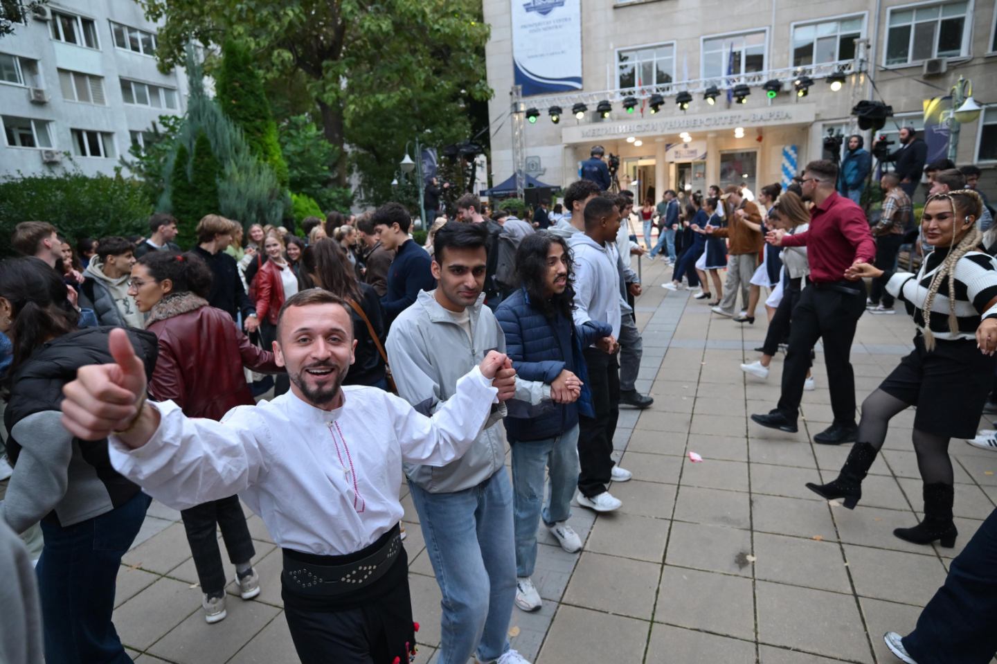Martin Ivov and Monika Stanchev -  first and third year students in the English–Language Training Programmes of MU-Varna, also joined the wishes for a successful new academic year. The singing talents of MU-Varna Victoriya Gadzhemova and Alan Paulson, the Student Indian Dance Group, consisting of Anriya Anand, Nimisha Reggie, Elaina Frayu and Niya Thomas, and the dancers from Diana Student Dance Ensemble were participants in the festive programme. Traditionally, the finale of the official opening was the Bulgarian Pravo Horo, which tempted lecturers and students to join the dance.