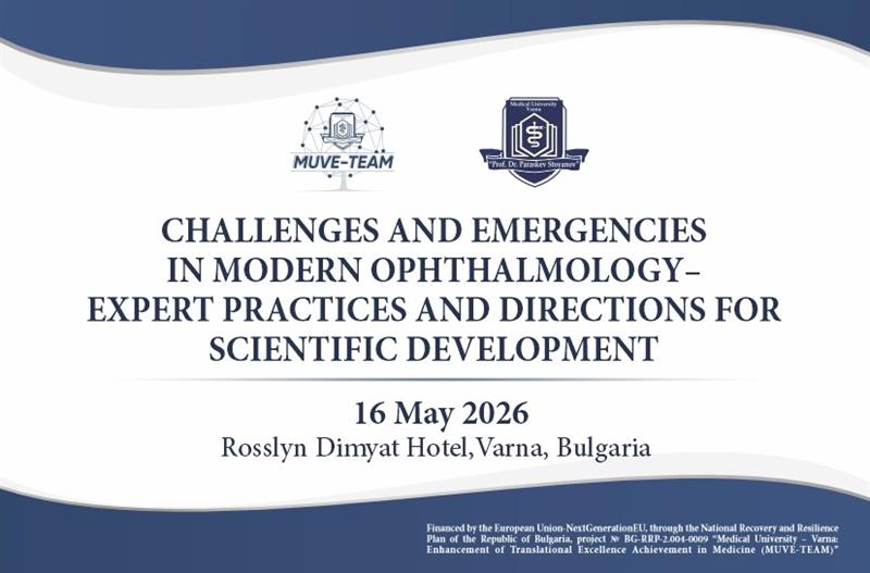 On 16 May, the Conference Centre of the Rosslyn Dimyat Hotel Varna hosts a scientific and practical conference entitled “Challenges and Emergencies in Modern Ophthalmology – Expert Practices and Guidelines for Scientific Development". The event is organised by the team of Scientific Group 3.2.1 “Artificial Cornea – from the Bench to the Bedside and Back", under project No. BG-RRP-2.004-0009-C02 “Medical University–Varna: Enhancement of Translational Excellence Achievement in Medicine (MUVE-TEAM)", funded by the European Union–NextGenerationEU, through the National Recovery and Resilience Plan of the Republic of Bulgaria.