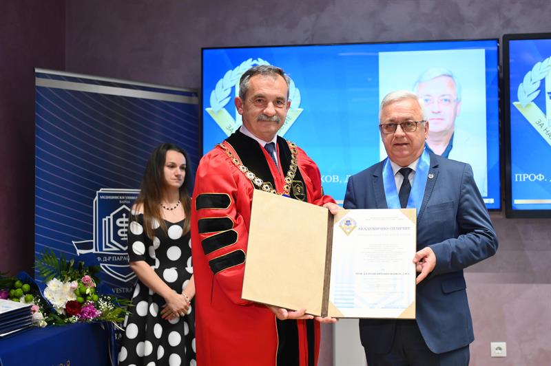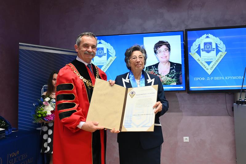 Prof. Dr. Vera Krumova, PhD – for outstanding merits to MU-Varna and high professionalism, responsibility and dedication; for contributions to the methodological guidance for development of the Department of Orthodontics at the Faculty of Dental Medicine; for laying the foundations of training in the field of Orthodontics; for the growth of the academic staff of the Department of Orthodontics.