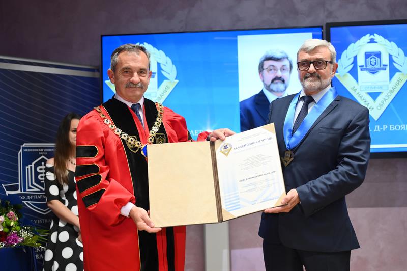 Prof. Dr. Boyan Balev, PhD –for active long-standing scientific and teaching activities in the field of Diagnostic Imaging; for outstanding contributions to the development of the diagnostic and therapeutic process at UMHAT “St. Marina"–Varna. Prof. Balev was Head of the Department of Diagnostic Imaging and Radiotherapy (2004-2020); Head of the Diagnostic Imaging Centre, Department of Radiology (2003-2020).